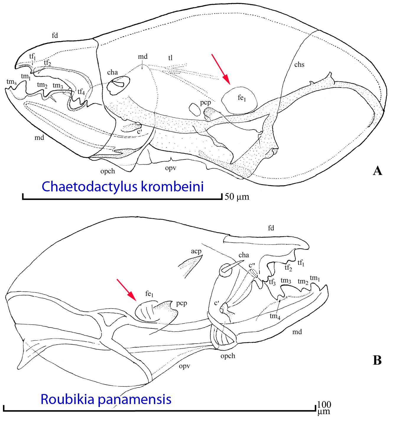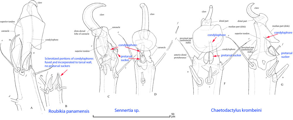 | 1 | Anterior paraxial process of cheliceral body developed; fenestrate area fe1 of cheliceral body vertically striated (Fig. 2 B). Solenidion w2 I proximal to seta d I. Tarsal setae w III, r III-IV, and tibial seta kT IV present. Females. Proximal ends of anterior apodemes I and pregenital sclerite separated. Inseminatory canal cylindrical, well sclerotized, protruding inside spermatheca. Male. Tarsal setae e III-IV absent; p III-IV absent, q III-IV present. Sclerotized portions of condylophores fused and incorporated to the disto-ventral sclerotized tarsal wall, pretarsal suckers not developed (Fig. 3 A). Heteromorphic males present ... Roubikia OConnor