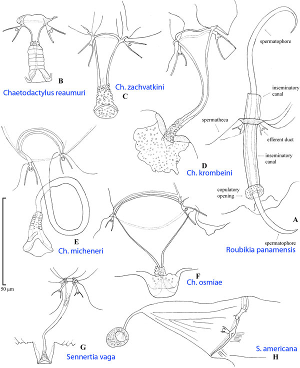 - | Posterior end of anterior coxal apodeme II with large sclerite. Setae h3 1.2-2.0 (1.5±0.2, n=8) times longer than h2. Associated primarily with Osmia tricornis. Italy (type locality), France, Egypt ... Chaetodactylus claviger Oudemans, 1924 |