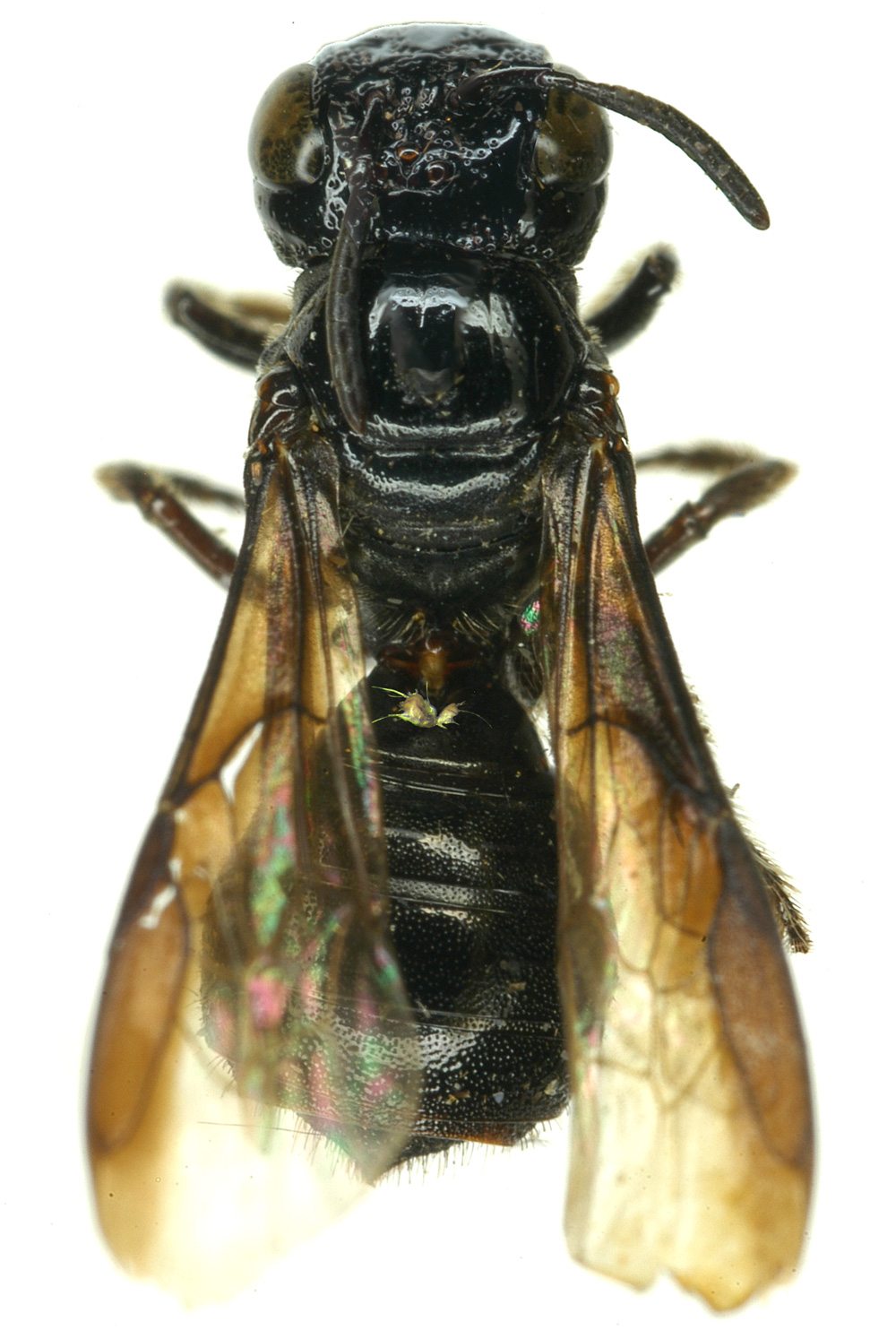 Fig 2. Phoretic deutonymphs of the mite Sennertia devincta near the entrance of the metasomal acarinarium of the bee, Ceratina sp., Peru (BMOC 03-0604-016).
