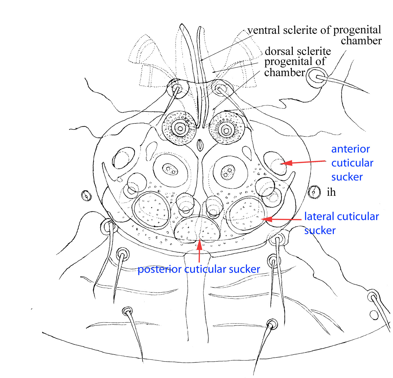 Description (unique character states underlined). Phoretic deutonymph. Gnathosomal solenidion, free palpi and their setae present. Alveoli ve dorsal, distinctly anterior to se. Prodorsal shield striation longitudinal anteriorly and transverse posteriorly. Prodorsal shield present. Posterior edge of prodorsal shield shorter than its lateral edges. Setae se situated on soft cuticle. Setae c2 situated on same transverse level as c1. Setae e2 situated on hysterosomal shield. Setae 1a and 3a touching posterior borders of respective coxal fields and filiform. Cupules ia situated on hysterosomal shield. Cupules im distinctly posterior to acetabula III, situated off line between d2 and e2. Cupules ip anterior to setae f2. Cupules ih situated on sides of attachment organ. Posterior part of posterior apodemes of coxal fields II not displaced posteriorly to anterior apodemes III. Coxal fields III closed. Coxal fields IV open. Transverse medial extension of posterior apodemes IV well-developed. Anterior extension of posterior apodemes IV present, connecting with anterior apodeme III. Ventral longitudinal sclerites of progenital chamber conspicuous at posterior part. Ventral longitudinal sclerites of progenital chamber conspicuous at anterior part. Posterior and lateral cuticular suckers (Fig. 2) present. Anterior cuticular suckers present (Fig. 2). Bases of anterior cuticular suckers inserted on separate apodeme (may touch or overlap posterio-lateral sclerotized border of the attachment organ) (Fig. 2). Apodemes of ps1 separated. Setae wa I-II submedial, f I-II apical, near tarsal apices. Solenidion ω2 present. Empodial claws I-III not twisted. Dorsal cuticular folds of ambulacra I-III absent (Fig. 3). Condylophores of tarsi I-III weakly developed, almost symmetrical. Supporting sclerites of condylophores (latero-apical sclerites of tarsus) indistinct from tarsus, not connected by dorsal bridge (Fig. 4). Disto-dorsal lobe of distal part of caruncle absent. Dorsal condylar plate of femur-tibia joint broad. Tarsi I-II with 7 setae (p and q present). Tarsal setae ra and la I-II foliate. Genual seta cG I longer or only slightly shorter than genu I and modified. Genual setae cG I longer than cG II. Tarsal setae q III present. Tarsal setae w, r, and p III present. Tarsal seta s III foliate. Sigma III absent, represented by alveolus. Tarsus IV with 8 setae (s, p, q present). Tarsal setae e, f IV foliate or slightly lanceolate. Tarsal setae w IV longer than leg IV. Tibial setae kT IV present. Solenidion φ IV absent, represented by alveolus.
