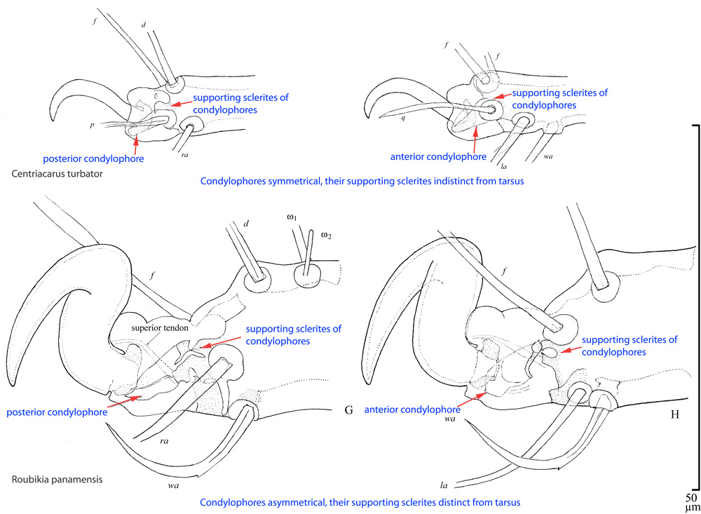 - | Free palpi shorter than basal width. Lateral margins of prodorsal shield only slightly longer or shorter than its posterior margin. Posterior ends of posterior apodemes II bent, directed outward. Lateral longitudinal hysterosomal sclerites at level of acetabula IV wider than cupule im, extending anteriorly almost to level of ia, and posteriorly to attachment organ. Coxal fields I-II smooth. Setae 3a distinctly longer than c3. Setae 4a situated on unsclerotized cuticle. Setae mG II nearly equal to or longer than combined length of femur-tibia II (ratio 0.8-1.2 (1.1±0.10)). Solenidion σ I reaching alveolus of φ and base of cG I. Setae kT and w IV finely barbed. Base of seta p IV closer to r IV than to e IV. Venezuela. On Centris sp. ... Centriacarus guahibo Klimov and OConnor, 2007