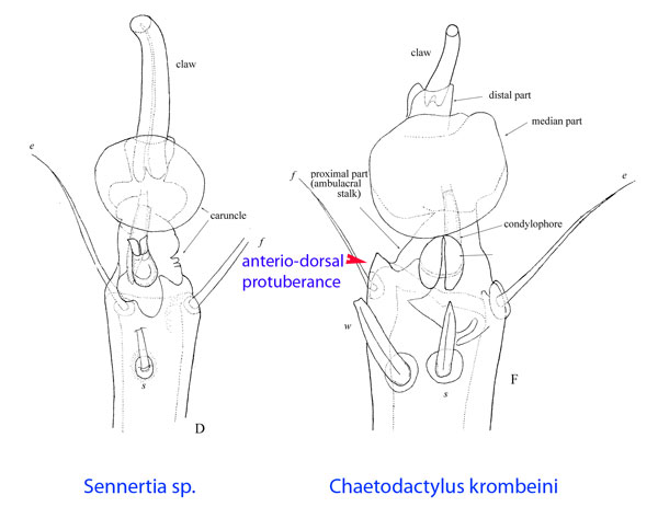 | 1 | Solenidion f IV longer than combined length of genu and tibia IV. Tarsal setae w, r, f, and e IV longer than tarsus IV and nearly uniform in length; all stiff ("non-bendable"). Suckers ad3 larger than inner unsclerotized area of suckers ad1+2. Associated with Melitoma (Apidae). Mexico: Chiapas, Oaxaca, Tabasco; Honduras: Yoro ... Chaetodactylus melitomae Klimov and OConnor, 2007 |