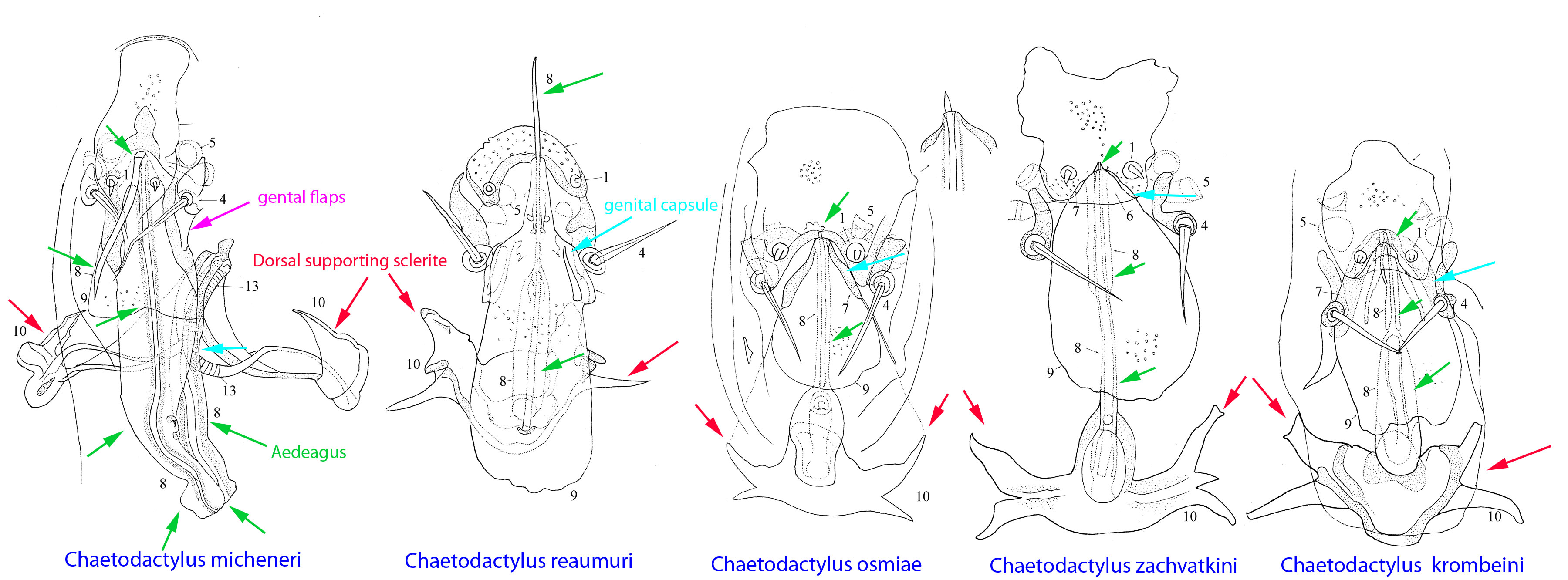 Fain, A. 1966. Notes sur la biologie des acariens du genre Chaetodactylus et en particulier de C. osmiae, parasite des abeilles solitaires Osmia rufa et O. cornuta en Belgique (Sarcoptiformes: Chaetodactylidae). Bulletin et Annales de la Societe Royale d'Entomologie de Belgique.102: 249-261.