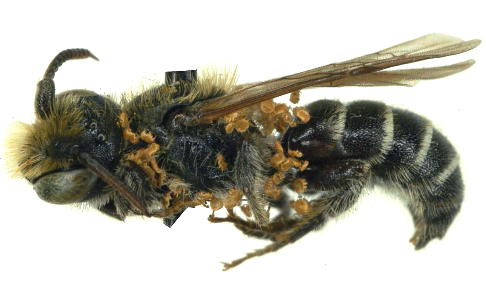 Material (show database records). (USA). Holotype: HDN - New York, Onondaga Co., Syracuse, ex female of Hoplitis producta (propodeum), 13 Jul 1978, M. O'Brien, UMMZ, BMOC 84-0409-001. Paratypes: 4 HDNs - same data as holotype; 16 females, 4 males - Albany Co., Rensselaerville, Huyck Preserve, ex nest of H. producta, 6 Jul 1975, K. Strickler 75-07-06A, UMMZ, BMOC 76-0113-001; 25 HDNs (7 slides) - Cattaraugus Co., Rock City, ex H. producta (dorsal and ventral mesosoma), 1 Jul 1916, No collector, CUIC, BMOC 79-0309-003; 2 HDNs - USA: Livingston Co., Tuxedo Park, ex H. producta mesosoma, 28 Jun 1928, AMNH, BMOC 04-0508-044; 6 HDNs - Rockland Co., Nyack, ex Hoplitis pilosifrons on propodeum, 27 Feb 1909, AMNH, BMOC 04-0508-041; 1 HDN - Rockland Co., Nyack, ex H. producta on propodeum, 27 Feb 1909, AMNH, BMOC 04-0508-042; 4 HDNs - Tompkins Co., Ithaca, bee nest in sumac (Rhus) twig, 2 Nov 1973, S. Vernoff, UMMZ, BMOC 73-1102-070; 21 HDNs (9 slides) - Tompkins Co., Ithaca, Fall Creek, ex H. producta (mesosoma), 28 Jun 1935, P.P. Babiy CUIC, BMOC 79-0309-002; 1 HDN - Idaho, Bear Lake Co., Bloomington Lake, ex female of Osmia inermis (propodeum & 1st metasomal tergite), 16 Jul 1950, G.E. Bohart, USNM, BMOC 96-0510-167; 5 HDNs - Maine, York Co., Saco, on Rubus (Rosales: Rosales), ex Hoplitis spoliata (pronotum), 7 Jun 1921, T.B. Mitchell, KU, BMOC 96-0916-334; 6 HDNs - Michigan, Cheboygan Co., Douglas Lake, Osmia brevis, on propodeum, July, C. H. Kennedy, OSU OSUC 0066119, BMOC 03-1106-022; 1HDN - Cheboygan Co., University of Michigan Biological Station, malaise trap residue, 29 Jun 1994, B. Scholtens, UMMZ, BMOC 94-0629-001; 15 HDNs - Kalamazoo Co., T2S, R12W sect. 7, ex Isodontia mexicana (Hymenoptera: Sphecidae) (mesosoma & propodeum), 4 Jul 1980, D. Cowan, UMMZ, BMOC 84-0409-005; 5 HDNs - Livingston Co., E. S. George Reserve, ex H. spoliata (mesosoma), 21 Jun 1980, L. Kirkendall, UMMZ, BMOC 84-0409-003; 5 HDNs - same locality and host (metasoma), 7 Jun 1972, F.C. Evans UMMZ, BMOC 91-1015-003; 3 HDNs - same locality and host, female (propodeum), 15 Jun 1971, F.C. Evans, UMMZ, BMOC 91-1015-004; 2 HDNs - same locality and host (head), 27 Jun 1972, F.C. Evans, UMMZ, BMOC 91-1015-005; 1HDN - same locality and host, female (mesosoma), 28 Jun 1972, F.C. Evans, UMMZ, BMOC 91-1015-006; 9 HDNs - same locality and host, female (propodeum), 3 Jul 1974, F.C. Evans, UMMZ, BMOC 91-1015-007; 3 HDNs - same locality and host, female (propodeum), 13 Jun 1980, F.C. Evans, UMMZ, BMOC 91-1015-008; 1 HDN - same locality, ex female of H. producta (head), 14 Jun 1972, F.C. Evans, UMMZ, BMOC 91-1015-009; 20 HDNs - Marquette Co., Huron Mountain Club, ex H. spoliata (ventral under head, few on mesosoma-metasoma), 26 Jun 1984, D. Gosling, UMMZ, BMOC 84-1121-001; 1 HDN - same locality, malaise trap residue, 21 Jun 1984, D.C.L. Gosling, UMMZ, BMOC 85-0719-001; 3HDN's - same locality, Hymenoptera in malaise trap 11 Jul 1985, D.C.L. Gosling, UMMZ, BMOC 85-0829-007; 1 HDN - same locality, ex Megachile relativa (ventral mesosoma), 23 Jun 1986, B. M. OConnor, UMMZ, BMOC 86-0623-011; 1HDN same locality, ex male of M. relativa (mesosoma), 25 Jun 1986, B. M. OConnor, UMMZ, BMOC 86-0625-007; 5 HDNs - Washtenaw Co., Pinckney State Recreation Area, near Halfmoon Lake, ex female of H. pilosifrons (head, pronotum - propodeum), 31 May 1982, M. & A. O'Brien, UMMZ, BMOC 84-0409-002; 10 HDNs - Washtenaw Co., Pinckney State Recreation Area, near Halfmoon Lake, ex H. spoliata (scattered over body), 31 May 1982, M. & A. O'Brien, UMMZ, BMOC 84-0409-004; 1 HDN - North Carolina, Buncombe Co., Black Mountain, Amorpha fruticosa, ex H. spoliata on propodeum, 19 May 1927, J. C. Crawford, AMNH 33827, BMOC 04-0508-046 ; 17 HDNs - , Buncombe Co., Black Mountain, ex H. spoliata on propodeum, 26 Mar 1909, AMNH 33827 BMOC 04-0508-047; 11 + 2 HDNs - , Swain Co., Great Smoky Mountains National Park, Forney Ridge & Andrews Bald, ex male of H. spoliata (ventral mesosoma + propodeum), 16 Jun 1946, R. R. Dreisbach ACC 980, GRSM 30589, BMOC 02-0525-013; 10 HDNs - Ohio, Hocking Co., ex H. producta (head), 1 Jun 1992, C. H. Kennedy OSU, OSU 0065821, BMOC 03-1106-037; 3 HDNs - Oregon, Curry Co., Illinois National Wild and Scenic River, Amorpha, ex H. producta on mesosoma, 20 Jun 1917, M. A. Cazier, AMNH, BMOC 04-0508-043; 20 HDNs - Tennessee, Sevier Co., Great Smoky Mountains National Park, Park Headquarters, ex Osmia bucephala (between coxae III), 20 Apr 1982, D. H. DeFoe, GRSM 30612, BMOC 02-0525-014; 10 HDNs - Wisconsin, Milwaukee Co., Milwaukee, ex H. pilosifrons on propodeum, 15 Jun 1902, S. Graenicher, AMNH, BMOC 04-0508-040; 4 HDNs - CANADA: Quebec, Hull, ex H. producta dorsal mesosoma and head, 14 Jun 1914, F. W. L. Sladen, AMNH, BMOC 04-0508-045. Holotype in UMMZ, paratypes in AMNH, GRSM, OSAL, UMMZ, UNAM.