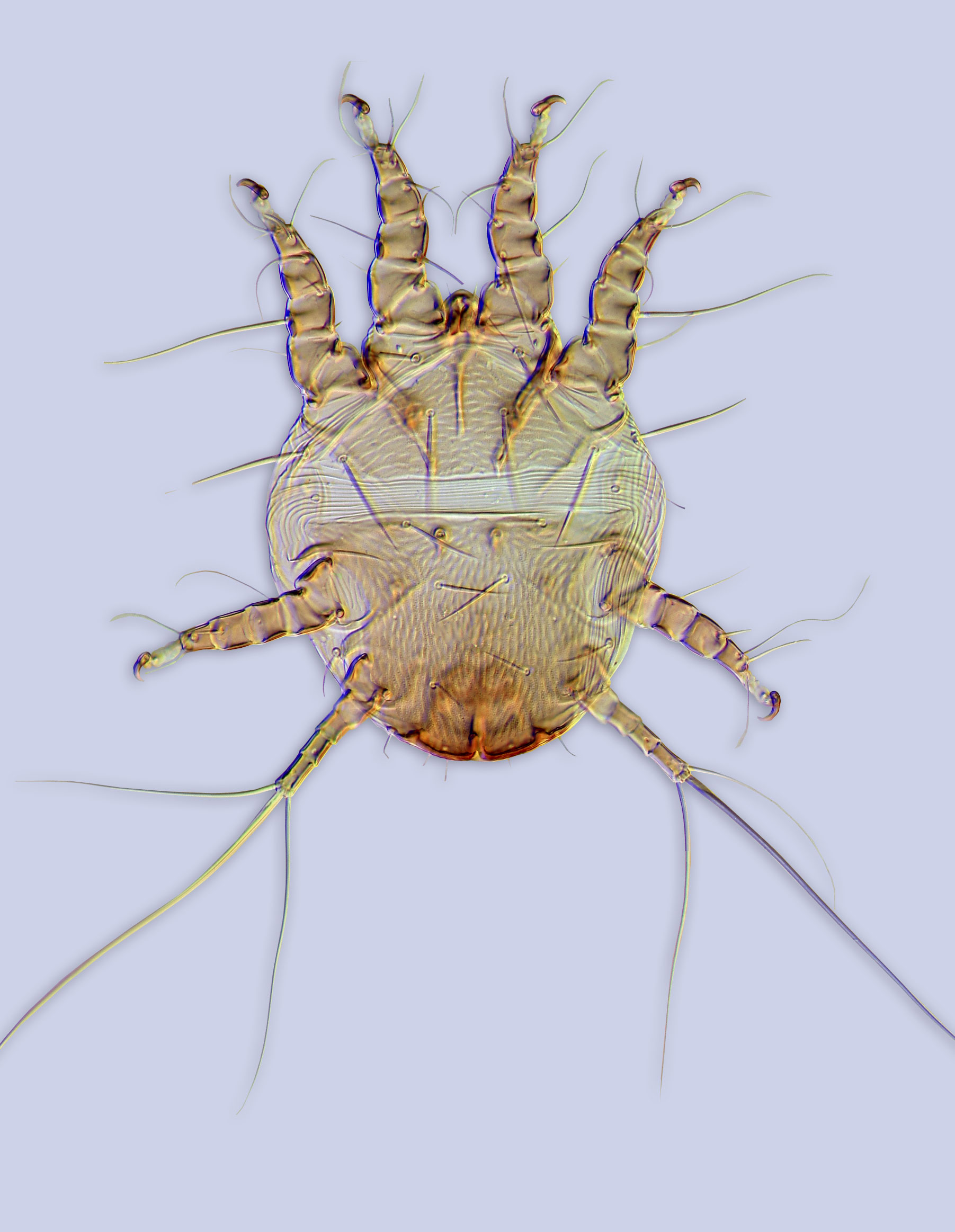 After killing and feeding on the bee egg or young larva, the female mite deposits her eggs principally on the cell walls beyond the pollen-nectar mass. The eggs hatch in 4 to 5 days into larvae. The larvae feed on nectar from the pollen-nectar mass and transform into protonymphs, which also continue to feed on the nectar. There is some doubt as to what happens next, but it seems probable that the protonymphs occurring early in the season transform directly into tritonymphs, bypassing the deutonymphal stage completely. However, Chaetodactylus deutonymphs were never found in nests early in the spring. The tritonymphs transform into adults, which in turn repeat the cycle, within the infested cell until all the provisioned food has been consumed. The number of generations and duration of breeding is dependent on the volume of the pollen-nectar mass.
