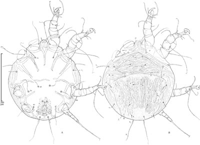 Description. See key. Click here for identification of 3 partially overlapping morphs (based on phoretic deutonymphs only). Known from all stages. Female (unique characters only): Setae c3 not extending beyond posterior level of trochanters IV. Inseminatory canal trumpet-shaped, more than 5 times longer than its width at spermatheca (Fig.). Sclerotized lining layer of outer end of inseminatory canal shorter than 0.4 length of inseminatory canal (Fig.). Setae gT I-II smooth, filiform; hT I smooth, hT II sparsely barbed to almost smooth. Homeomorphic male (unique characters only): Setae d1 not extending beyond e1. Aedeagus folds posterior to dorsal supporting sclerite (Fig.). Transverse processes of dorsal supporting sclerite spirally twisted, band-like (Fig.). Genital valves with posterior cuticular flaps (Fig.).