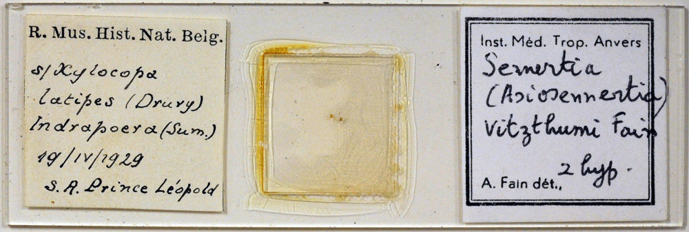 Sennertia (Asiosennertia) vitzthumi Fain, 1981a: 172, Figs 47, 48, 62 (holotype HDN in ZSMC A20031437; description of HDN, included in key. Original label information: "No. V 3068. Sennertia alfkeni Ouds. 2-Ny, Exuvie,14.9.1928")